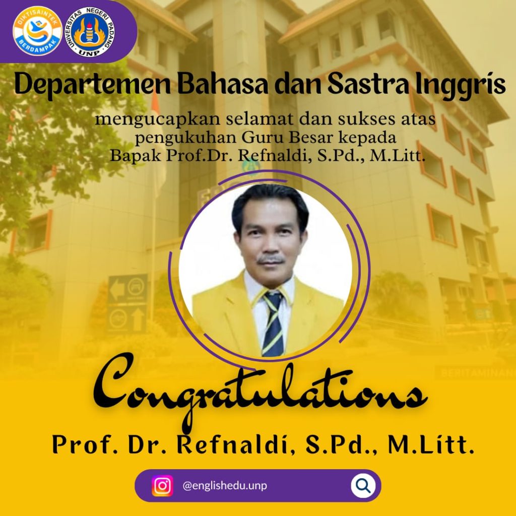 Penganugerahan jabatan akademik tertinggi ini menjadi bentuk penghargaan atas dedikasi, kontribusi ilmiah, dan pengabdian panjang beliau dalam dunia pendidikan dan penelitian di UNP. Prof. Dr. Refnaldi, M.Litt. dikenal sebagai dosen yang berkomitmen tinggi dalam pengajaran, penelitian, dan pembimbingan mahasiswa, serta aktif berkontribusi dalam pengembangan ilmu bahasa dan pendidikan bahasa Inggris di Indonesia.